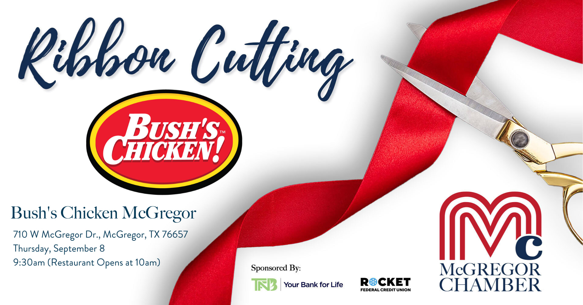 Join us for a Ribbon Cutting! We are excited to celebrate the Grand Re-Opening of the Bush's Chicken McGregor location. Join us for a Ribbon Cutting ceremony at 9:30am, before the doors open for business at 10am. Come out and support the local McGregor Business Community!Additional Info