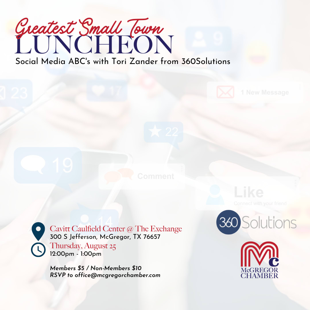 Join us for our monthly Greatest Small Town Luncheon to learn about the Social Media ABC's from Tori Zander with 360Solutions.