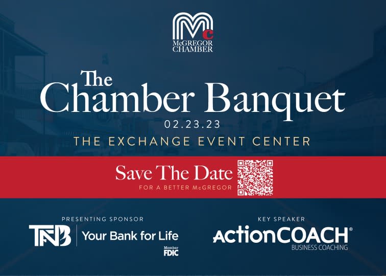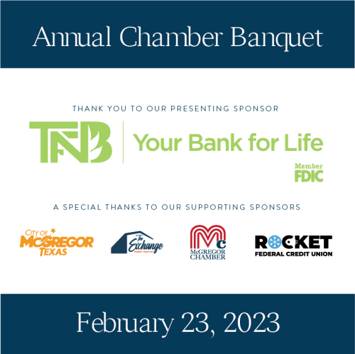 The Chamber’s Banquet will be held Thursday, February 23, 2023, at The Exchange Event Center in McGregor. Chamber members, citizens, business and civic leaders will gather for a special evening celebrating the McGregor business community and it's volunteers.